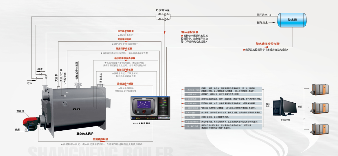 WZK型低氮(NOX<30-50mg/m3)冷凝燃气真空热水锅炉智能化功能介绍: