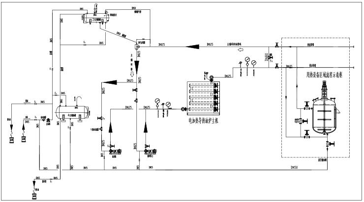 电加热导热油炉供热系统由电加热导热油炉主机,热用户(用热设备)、膨胀槽、贮油槽、热油循环泵、注油泵、油过滤器、油气分离器等设备组成。